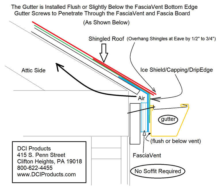 Focusing on the importance of roof intake ventilation and concerned about the growing number of litigation cases against large established roofing companies & manufacturers regarding mold and moisture issues, DCI Products Inc. introduces FasciaVent for the metal & asphalt roofing industry. FasciaVent installed on asphalt or metal roofing allows cooler air to enter through the fascia traveling under the entire roof decking structure and out the preferred ridge vent or other exhaust apparatus.